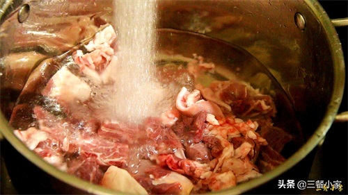 ④ 羊排煮制的时间到后,加入所有的配料,调入适量的食盐和鸡精,把汤煮开继续煮30分钟即可开吃。