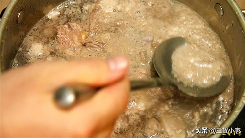 第二步,是焯水。羊肉要冷水下锅,这样能把羊肉里剩余的血水慢慢的逼出来,膻味也会去得更干净。同时在羊肉汤刚煮开的时候也要及时取出浮沫,这一步一个是可以撇去脏东西,避免血沫什么的从新粘到羊肉上去,同时也是在撇去膻味。