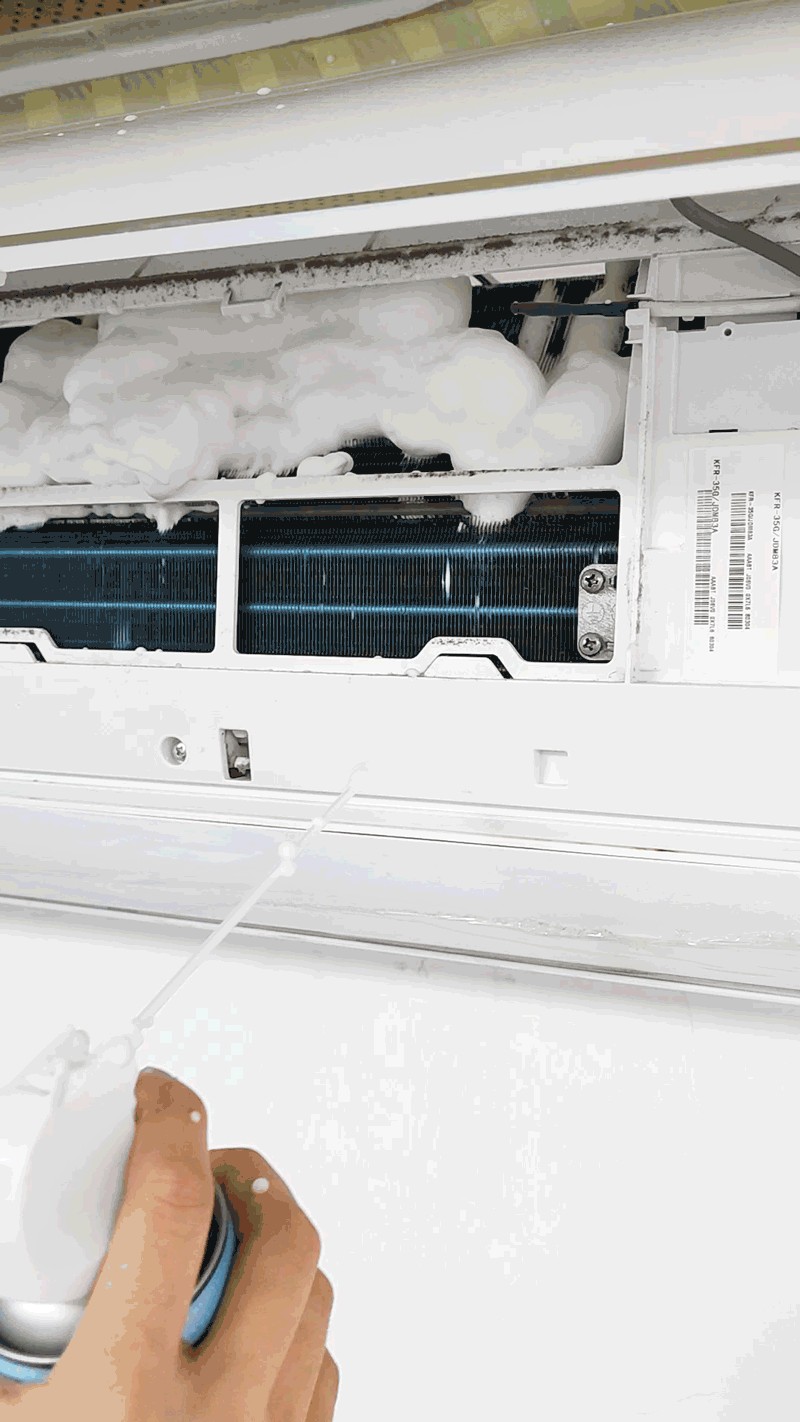 最后提醒大家,空调需要定期清洁,尤其是长时间没有使用的空调,开启前建议深度清洁一次。使用专用的空调清洁剂非常简单,只需要将清洗剂泡沫喷在空调散热片静置15分钟后,开启空调,让它自动循环清洗即可,省去了繁琐的拆卸和清洗过程。