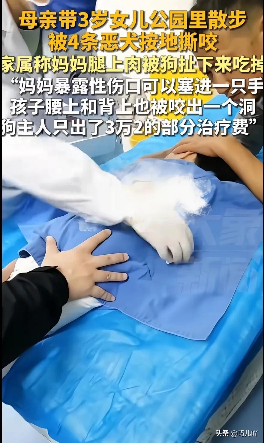 女子和三岁女儿被4条恶犬咬成重伤。腿上肉被狗吃了,后背有大洞