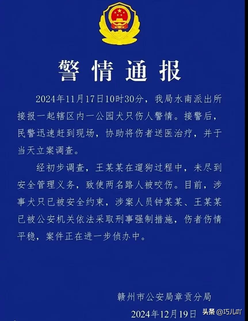 目前,警方已对狗主人钟某某和王某某采取刑事强制措施。