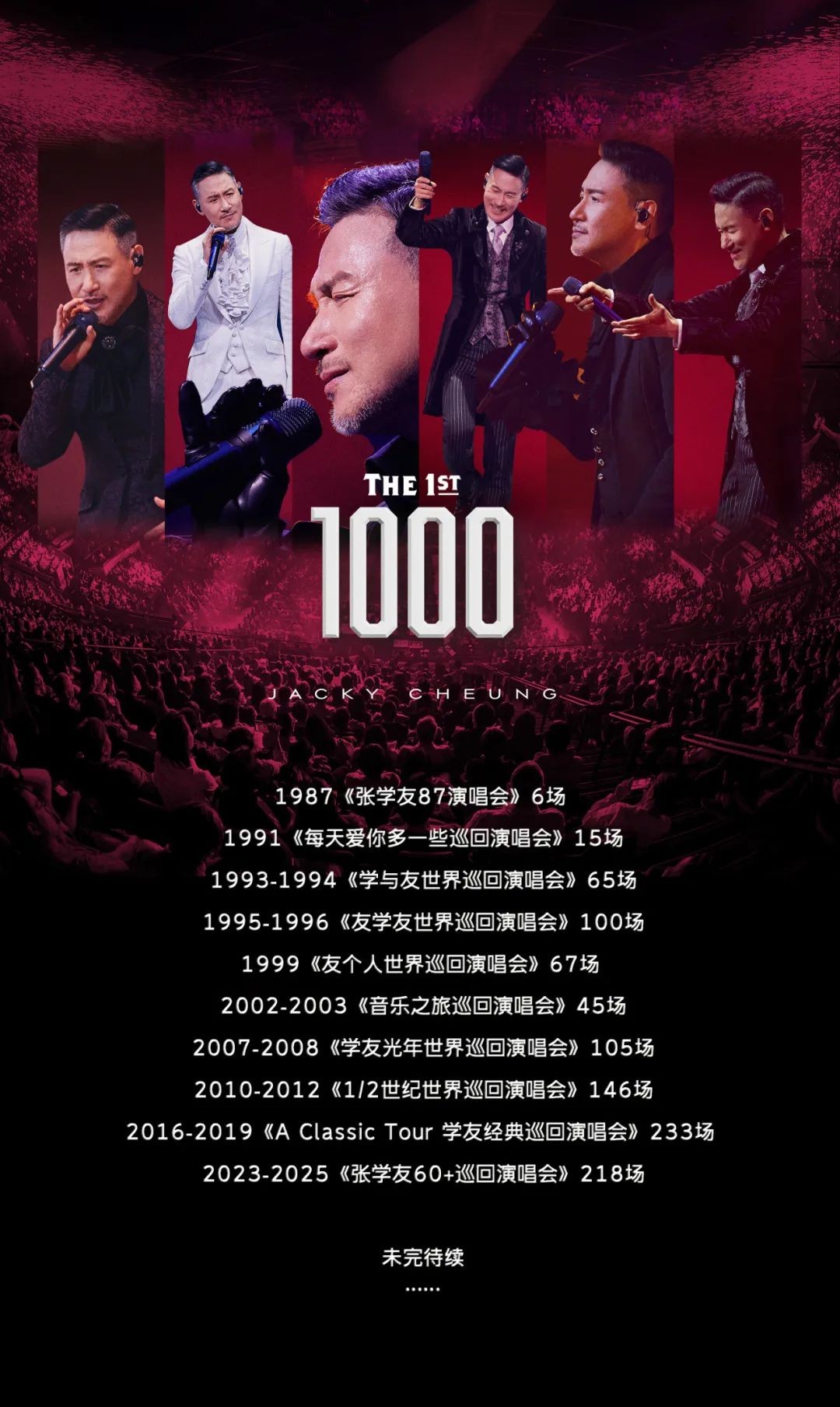 昨日,“歌神”张学友在海口圆满完成《张学友60+巡回演唱会》的第218场演唱会,同时也是他歌唱生涯四十年来的第1000场个人巡回演唱会,成为有史以来首位巡回演唱会场次突破千场的华语歌手。