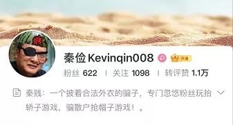微博上有一个叫“秦俭Kevinqin008”的用户,就是专门揭发Kevinqin008的。用他的话来说,秦“是一个披着合法外衣的骗子,专门忽悠粉丝玩抬轿子游戏,骗散户抢帽子游戏。”有意思的是,这个人还拥有600多个粉丝,转评赞达到1.1万。