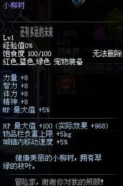 属性为:力量+8智力+8体力+8精神+8HP最大值+100物品栏负重上限+5kg城镇内移动速度+5%