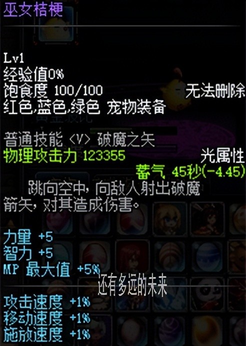 属性为:力量+15智力+15MP最大值+5%攻击速度+5%移动速度+5%施放速度+5%命中率+1%回避率+1%城镇内移动速度+5%