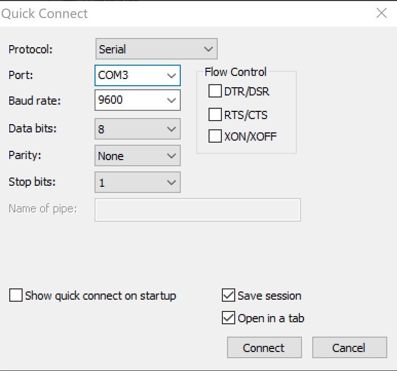 然后在终端软件中创建一个连接,协议选择serial,端口就是刚才我们在设备管理器中查看的com3,波特率常用的有9600和115200,也有些厂商的设备用其他波特率,具体如果连不上可以查看厂商文档。其他配置默认,流控不要打勾点击connect连接就可以成功登录了。