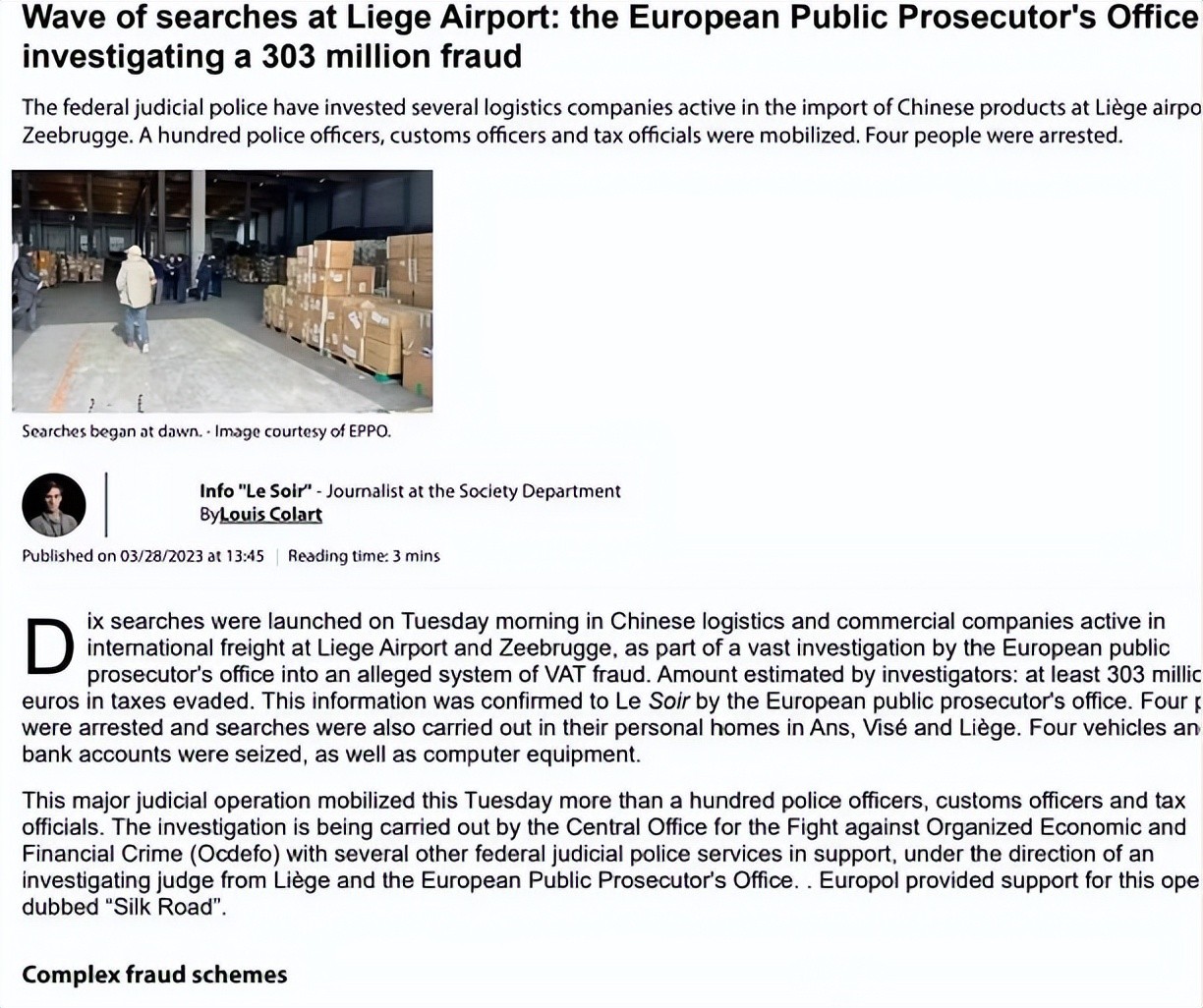 今年3月,欧洲检察官办公室突袭检查列日机场在内的几个重要清关地点,对处理国际货运的中国物流公司和商业公司先后进行了十次搜查行动。结果有中国货代公司被查出涉嫌逃税3.03亿欧元,这件事情在跨境电商行业引起了“大动荡”。