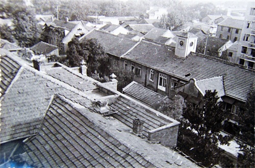 从北院住院部楼顶俯瞰院区,有小型钟楼的两层楼房为医院门诊部,现为医院食堂,为唯一保存的老建筑