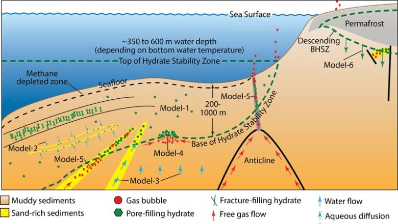 并且科学家对探测的可燃冰提出了六种定量模型,用来解释在野外观察到的不同水合物沉积物,分别是局部生物成因(Model-1),局部扩散(Model -2),向上水流和/或扩散(Model -3),甲烷循环(Model -4),远程自由气体流动(Model -5)和气藏凝固(Model -6)。