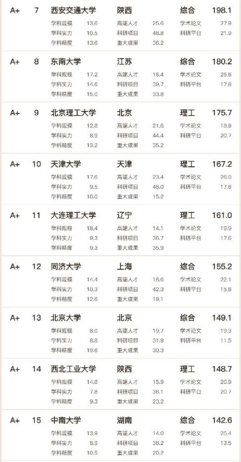 除了上述10所高校之外,天津大学、大连理工大学、同济大学、北京大学、西北工业大学以及中南大学进入了前15位,而这些高校也都是我国工科界独当一面的存在。