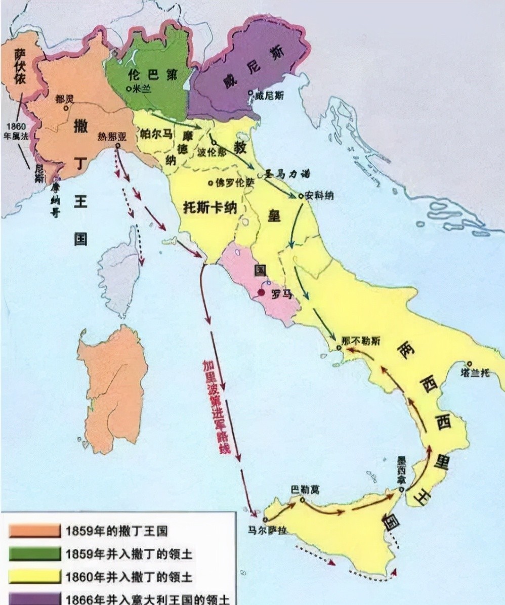 时间来到19世纪中叶,拿破仑战争后的欧洲民族解放运动此起彼伏,受此影响,意大利先后发起三次统一战争,1861年意大利王国在原先萨丁王国的基础上正式成立,随后趁普奥为争夺德意志地区主导权而爆发战争的契机,站在了普鲁士一方,最终于1870年完成了现代意大利的统一。