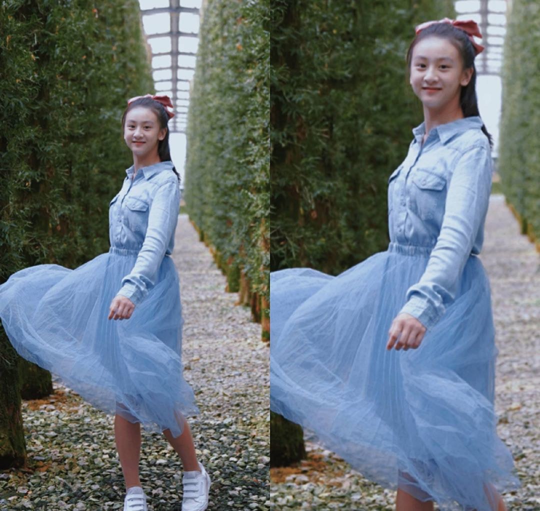 可以见得小小年纪的森碟对于服装的驾驭能力已经很优秀了,凭借着天生的好底子,森碟不仅个子高挑,四肢显瘦,鹅蛋脸也十分的上镜。