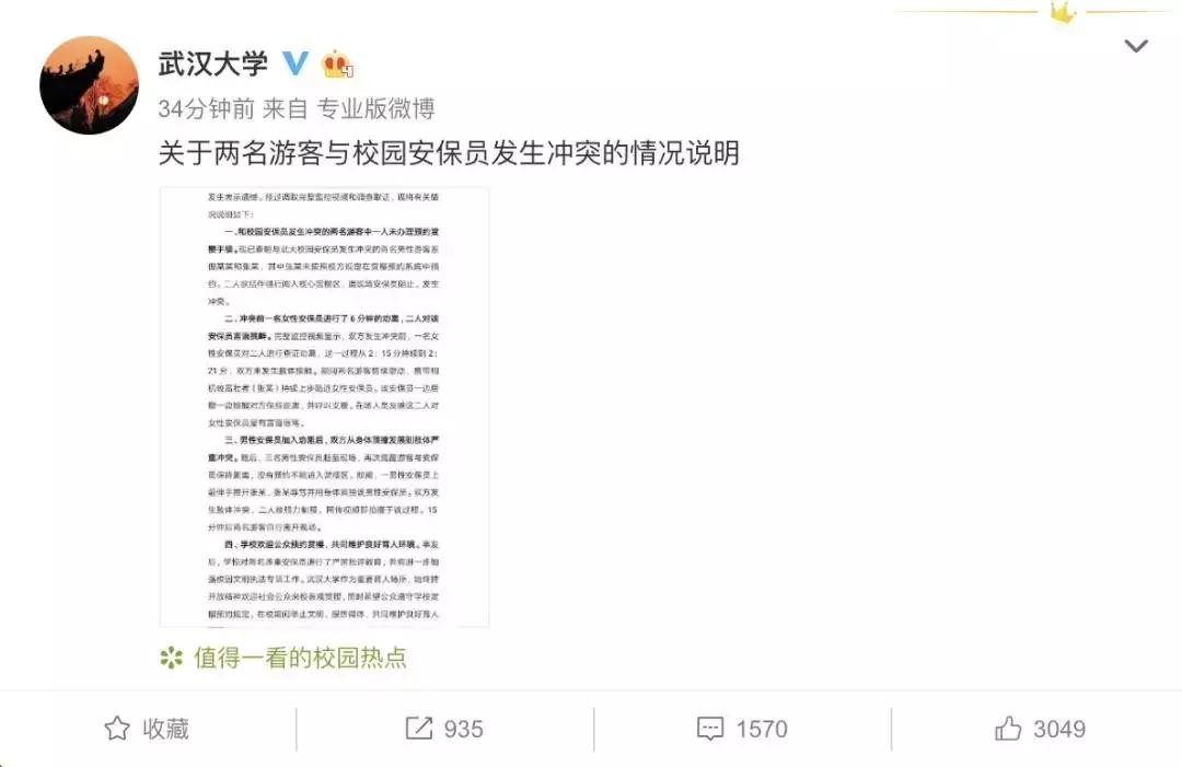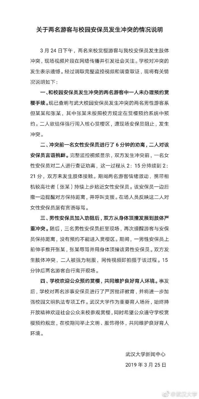 3月25日晚11点23分,武汉大学在官方微博上对此事作出回应:两游客中一人未办理预约赏樱手续,发生冲突前曾对女性保安进行言语挑衅。