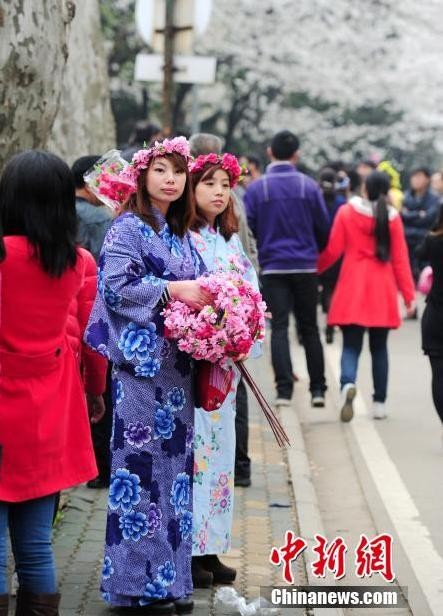 2009年3月22日,一对母女穿着淡紫色和花色的和服在武大樱园内拍照留念,遭十余人轰赶,并称“不要穿和服在武大拍照!”“穿和服的日本人滚出去!”