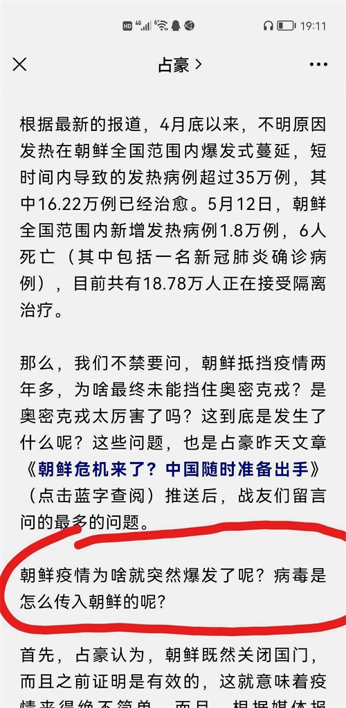 题目一经问出,扑面而来的是占豪的深度观点,他不仅发现了朝鲜为何在长时间的封闭后,忽然爆发了“新冠”,还从多个角度进行了深入分析,颠覆了一般观点,引发无数讨论。