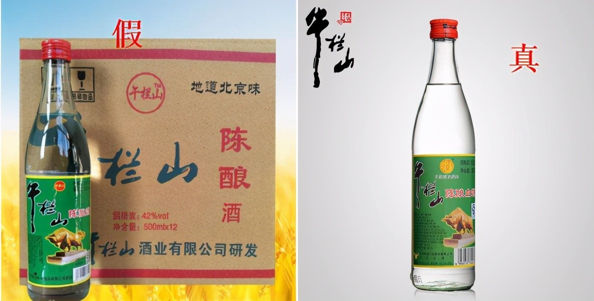 一个是牛栏山,一个是午栏山。别说你没喝过酒看不出来,就算是喝了几年牛栏山的老酒友,也未必看得出来。这种就是典型的模仿品牌名,以达到以假乱真的效果。大家如果在生活中稍微不留神就会中招。