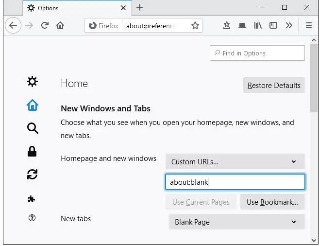 2. 在自定义 URL 中输入“about:blank”,或者将“Blank Page”设置为默认主页