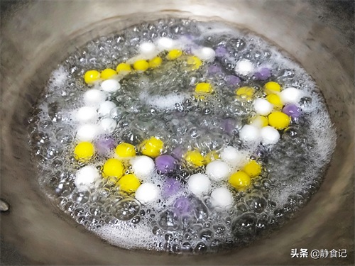 第四步:锅中烧开水,然后分批放入小丸子,放的同时需要用勺子轻轻的往前推散,防止粘连和粘锅底。当小丸子煮至完全浮起,再煮1分钟即可捞出备用(假如你揉的丸子比较大,时间需要延长)。