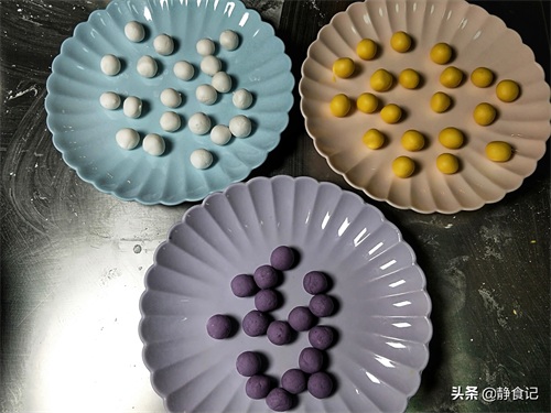 第三步:分别把三个面团揉成长细条形状,切成小段,再把切好的糯米团揉成光滑的小丸子。