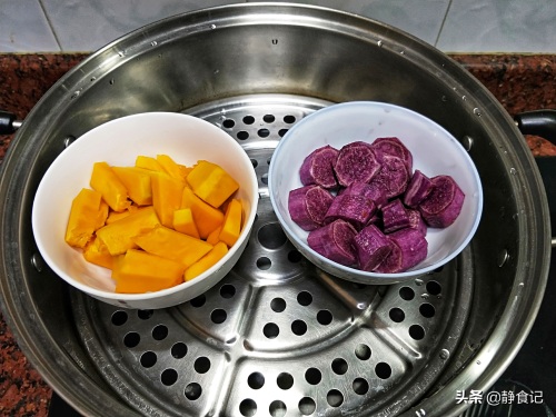 第一步:南瓜去皮切小块,紫薯去皮切小块。放蒸锅中,水开后蒸10分钟。然后把蒸好的南瓜和紫薯用勺子压成南瓜泥和紫薯泥。