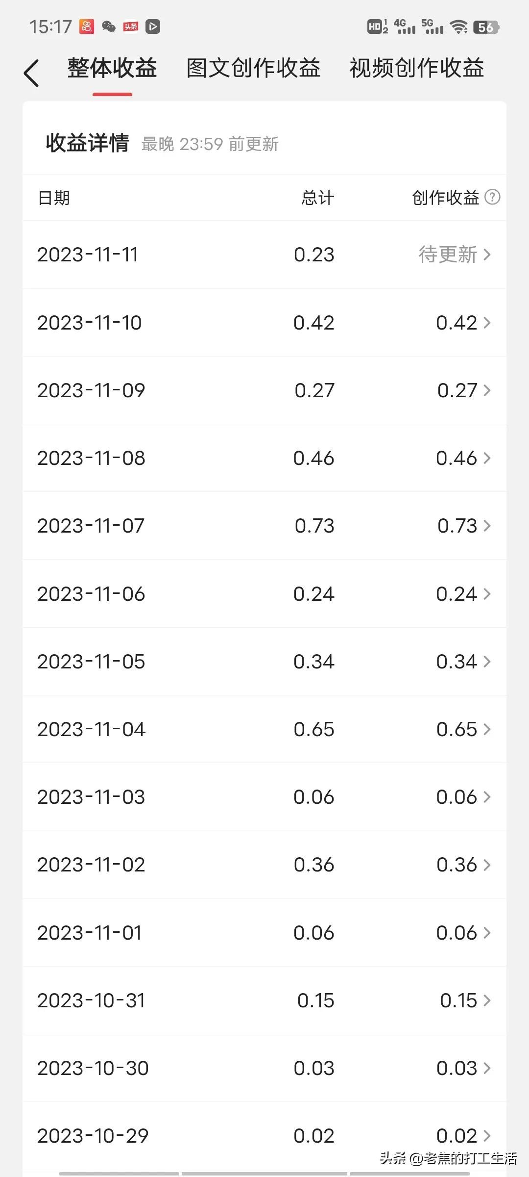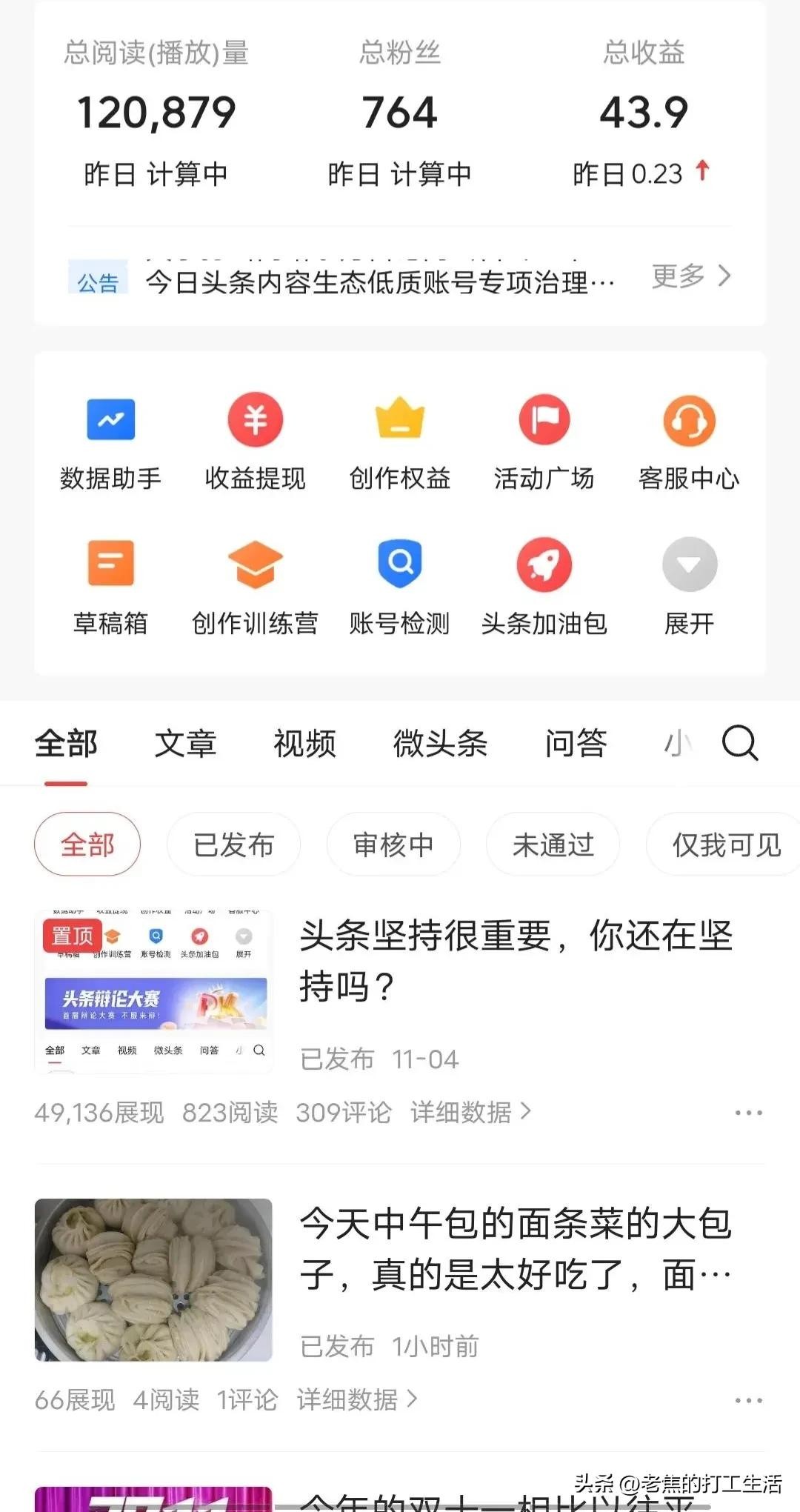 做头条我想说的是更多的人是想了为了挣钱,想把头条创作当作自己的一个副业,头条创作很多人一开抱着很高的期望进入希望在头条上能挣到钱,但现实是很多人加入头条以后没有多长时间就放弃了,头条是个综合性平台,涌入头条创作的人非常多,而且里面有非常多的优秀的创作者,普通人做头条一开始是非常的困难,我在头条上做了很长时间了,每天的收益也就几分几毛,确实收益比较低。