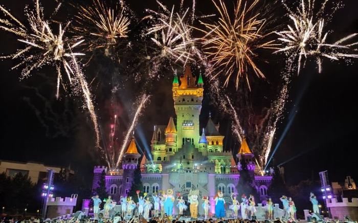 青岛方特梦幻王国夏夜的正确打开方式,从一场璀璨闪耀的盛大烟花开始,《熊梦奇缘》主题烟花秀,浪漫的烟花在夜晚绽放,带来一场梦幻的视觉盛宴。