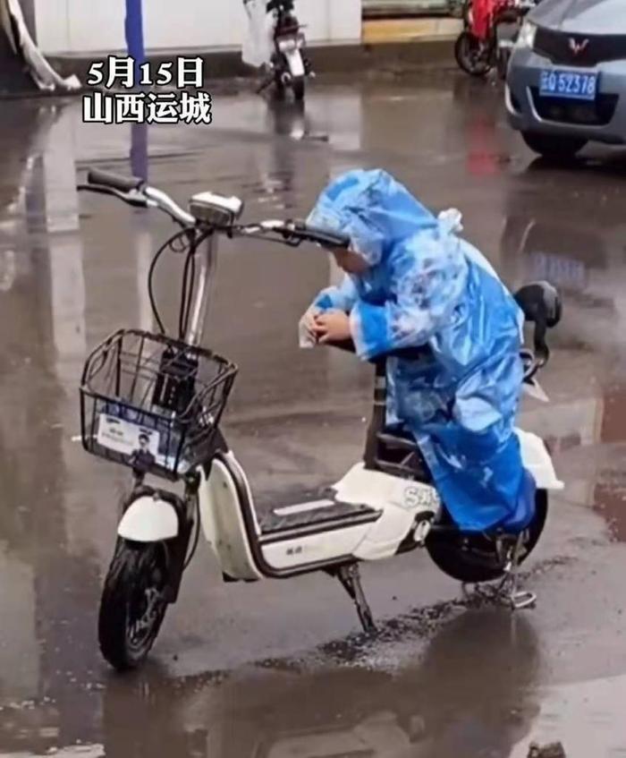 在一个下雨的天气里,穿着雨衣坐在电动车上等妈妈的小朋友,努力地向前屈伸,双手紧紧地抱着妈妈的座位。