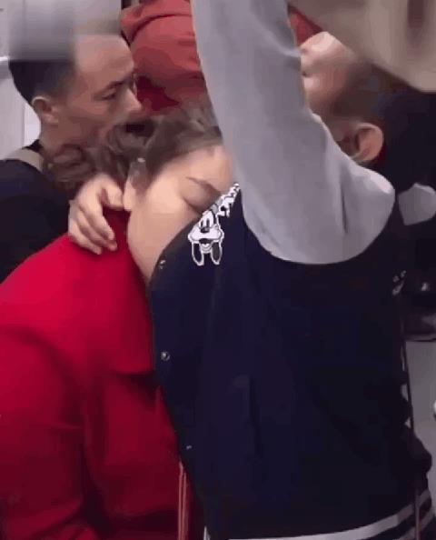 身边年幼的儿子见状赶紧用力踮起脚尖,一只手抓住扶手,一只手揽住妈妈的头,让自己的肩膀成为妈妈的枕头。