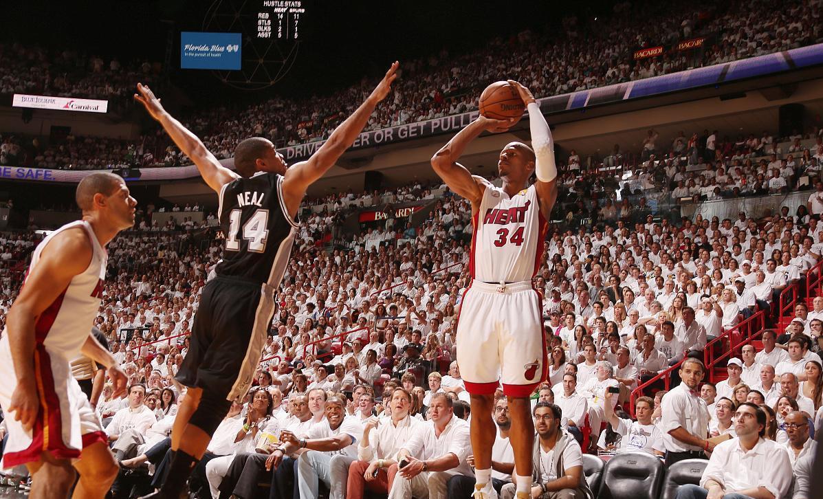 雷阿伦在第六场总决赛的最后时刻,投入逆天三分拯救了球队,和马刺队的总决赛抢七大战,热火队历经苦战奏凯,三巨头艰难实现卫冕。
