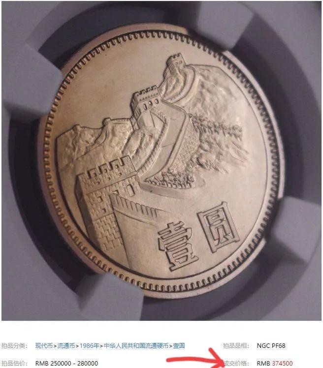 第三种,就是非常罕见的长城1元。它发行于1980年,共7个年份,只有4个年份进入了流通。发行初要礼品装帧,后来面向国外发行,用于文化交流,互换礼品和赚取外汇的重任。82年,84年和86年这3个年份没有进入流通,只面向海外发行。其中86年发行的长城1元硬币,发行量最少,只有660枚,它在一次拍卖会上拍出了37.45万元的天价,成为资深藏友追捧的偶像。