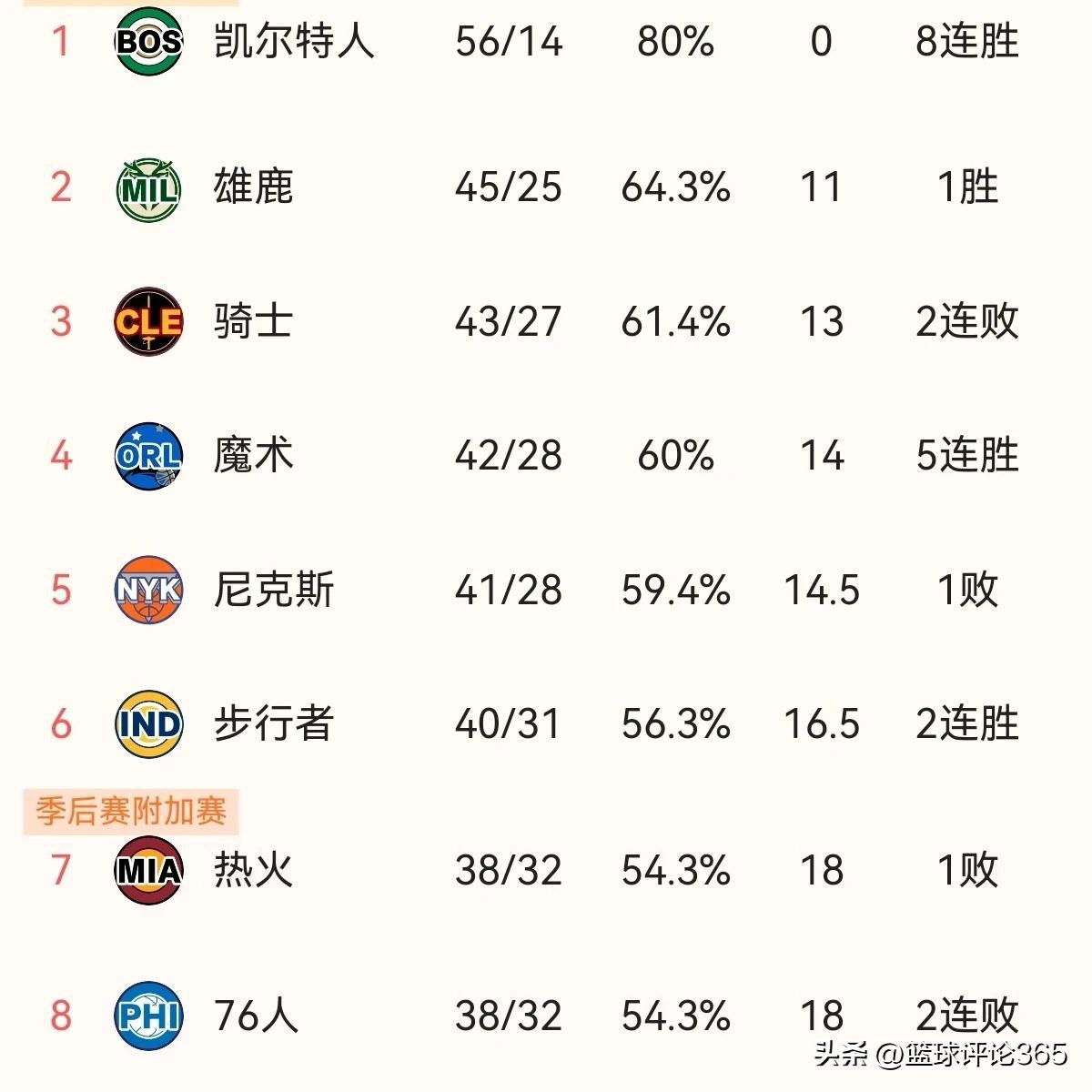东部排名榜出炉:绿军领衔,2球队垫底;黑马坐4望3,热火76人并列