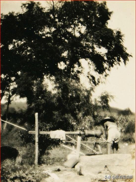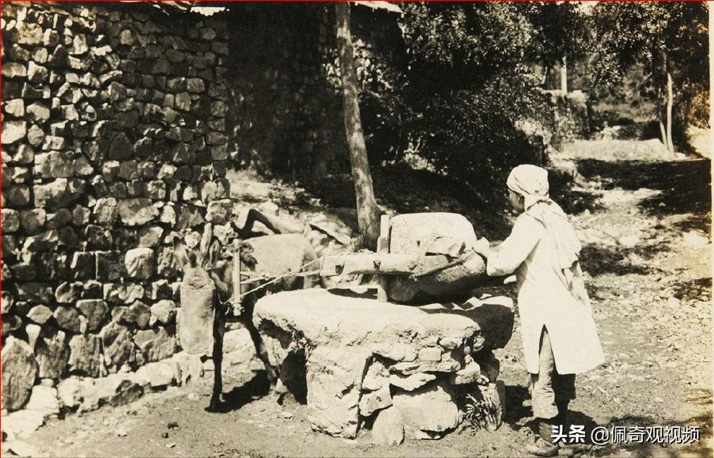 拍摄于1920年--农家正在将麦子、高粱等农作物在广场上晒干脱粒。
