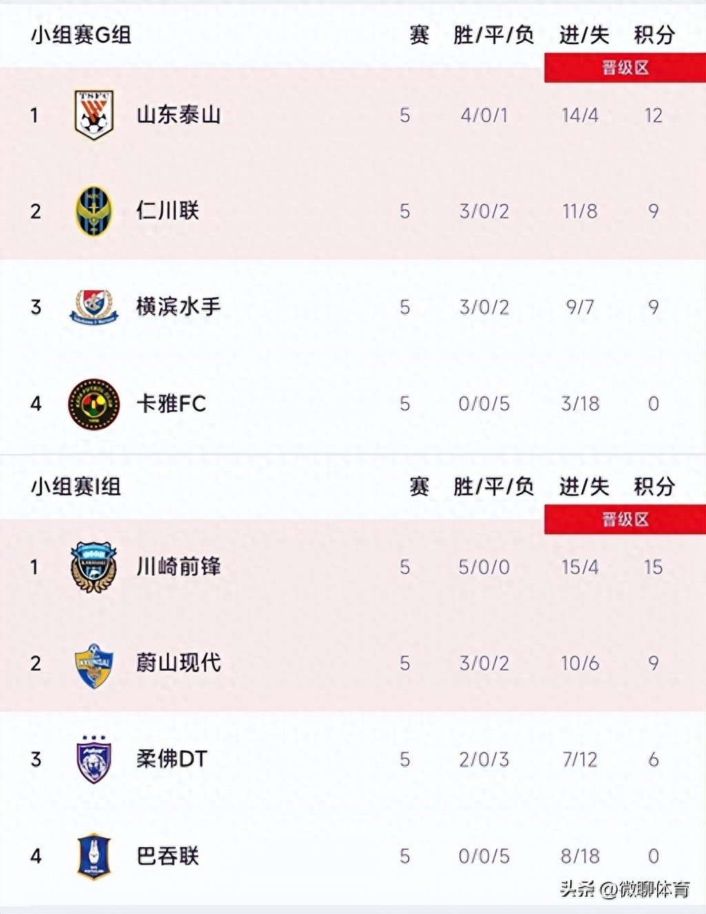 亚冠最新积分榜:山东4胜G组第一,仁川双杀横滨,川崎5连胜出线