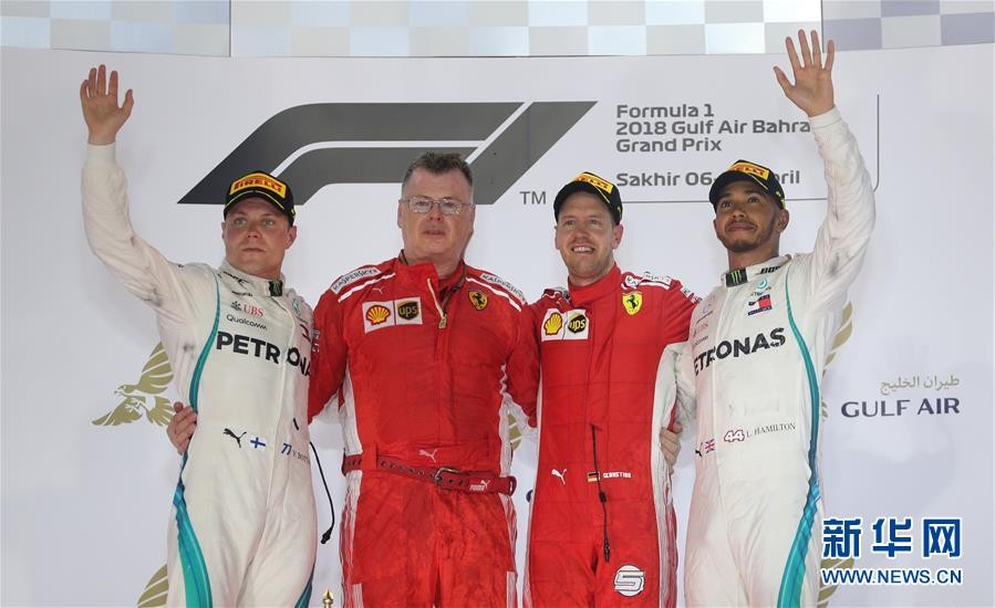 ↑4月8日,维泰尔(右二)、博塔斯(左一)与汉密尔顿(右一)在颁奖仪式上。新华社/路透