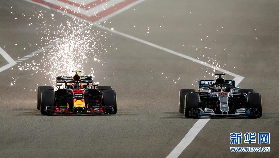 ↑4月8日,梅赛德斯车队英国车手汉密尔顿(右)与红牛车队荷兰车手维斯塔潘在比赛中。 新华社/路透