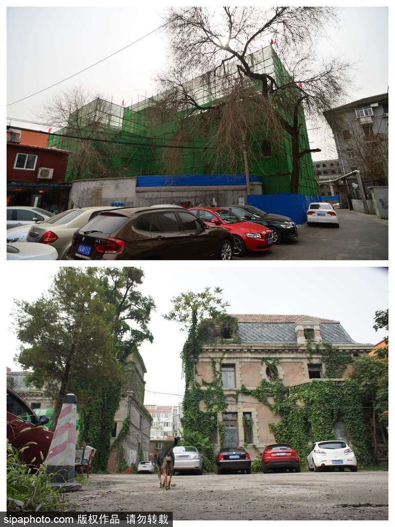 2016年3月6日,正在改建中的北京朝内大街81号“鬼楼”(上)和2014年7月30日因电影《朝内81号》而火爆的朝内81号院。