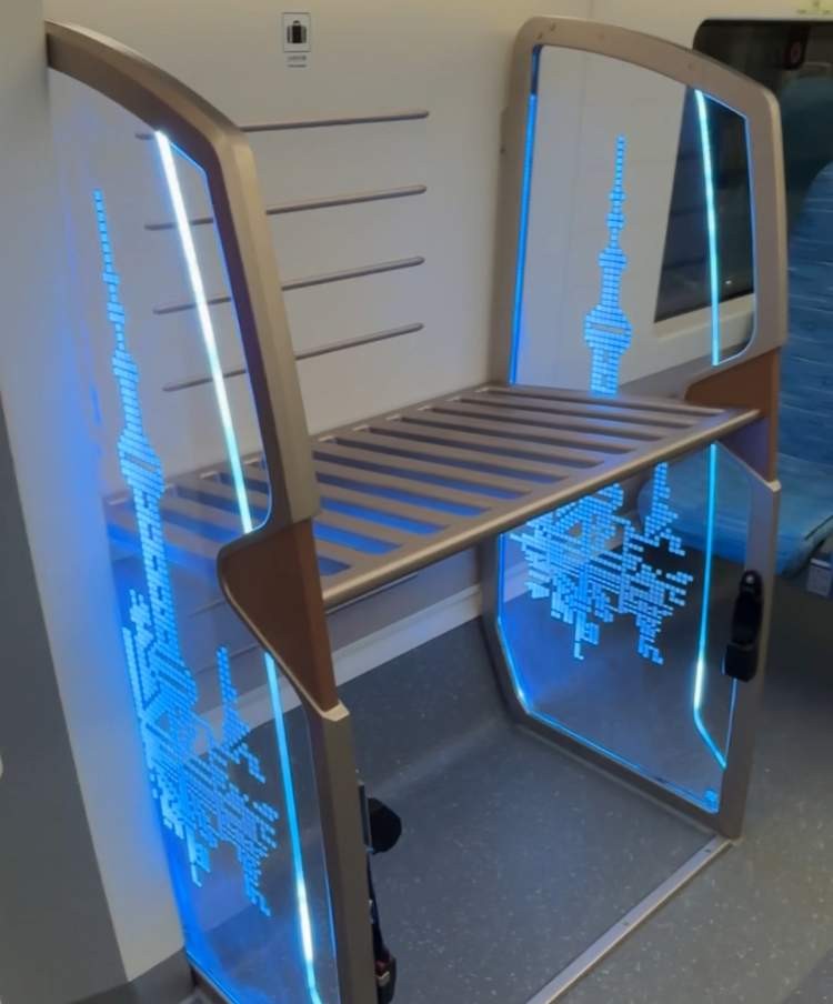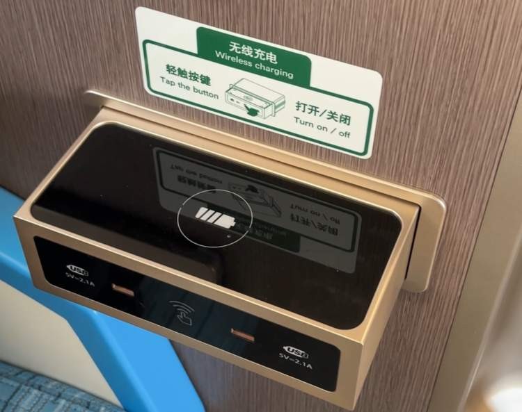 车厢内部类似高铁,细节设置很贴心,座位下面有充电插座,也配备了无线充电装置,有大件行李安放处,座位上方为小件行李架。