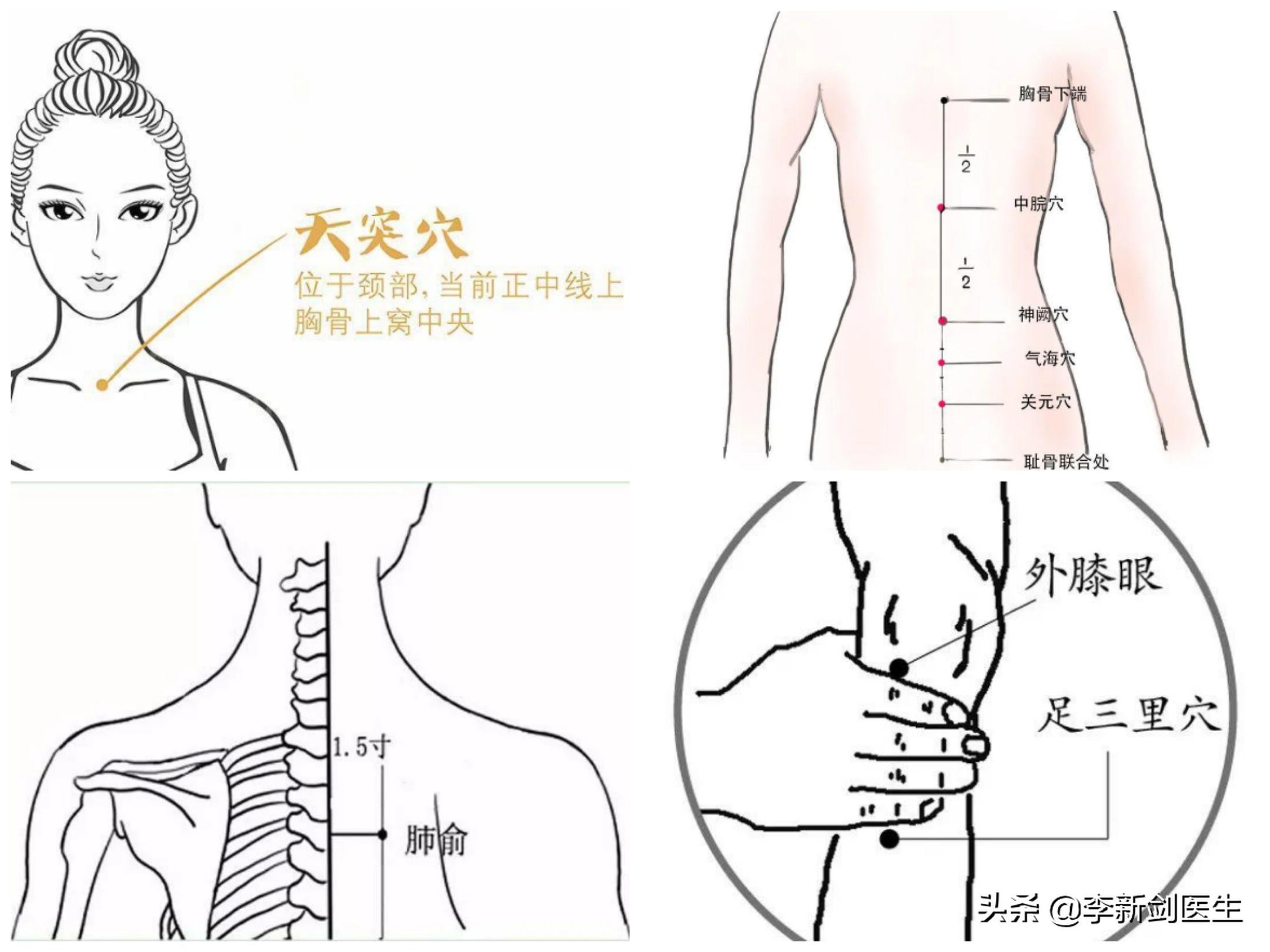 足三里和中脘是与胃相关的穴位,分别为下合穴和募穴,两穴均有调理脾胃的功效;天突穴多用于咳嗽等肺系病症,与肺俞穴均为治疗肺系疾病之要穴,两穴合用利于肺的宣降功能;气海位于下焦,可补益元气,膻中穴为“气会”,对先天之气、后天之气以及肺之清气均有一定调理作用。诸穴合用,增强了膻中调气之功效,扩大了治疗的病症范围。