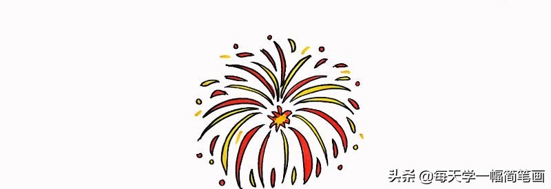 4、最后就是涂色啦,我们给烟花的中心涂黄色和红色,边缘也涂黄色和红色,漂亮的烟花简笔画就完成啦!