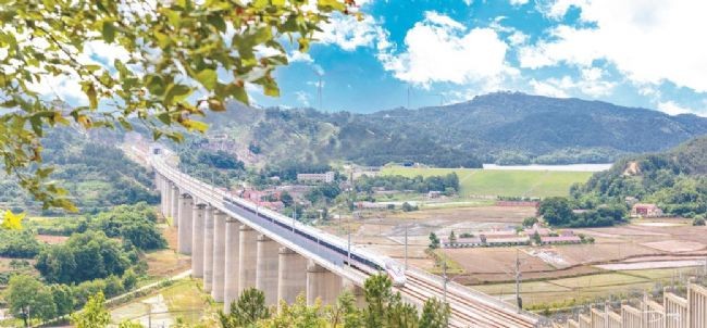 6月11日,高铁行驶在武穴市大金镇。今年4月,武汉至杭州高铁黄冈至黄梅段正式通车,武穴人民见证了高铁时代的到来,高铁给武穴人民带来新的希望。 (通讯员 许敏 摄)