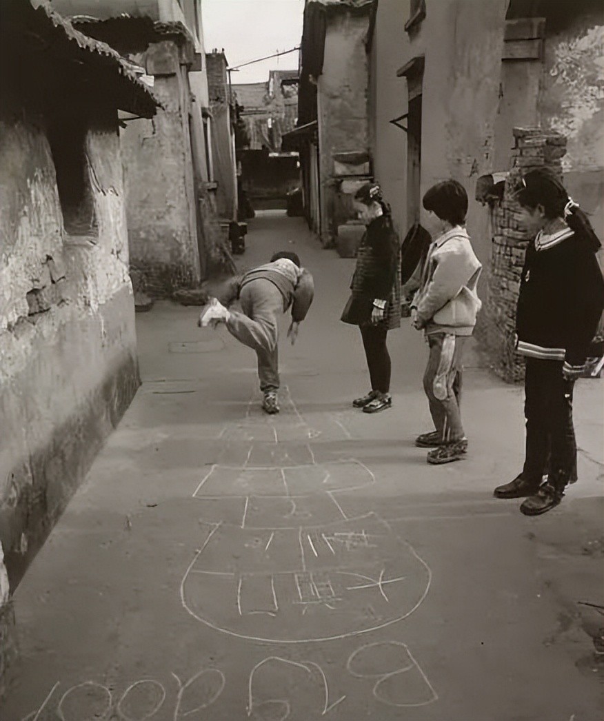 跳房子,还有蹦格。这个游戏是我们童年经常玩的,因为物质匮乏的年代,一起做游戏开心就行。用树枝在地上画上格格,然后用沙包或者拿一块方的石头,安装画的格格要求单腿或者双腿跳。就这样的游戏玩得满头大汗的,所以那时候普遍身体素质比较好。
