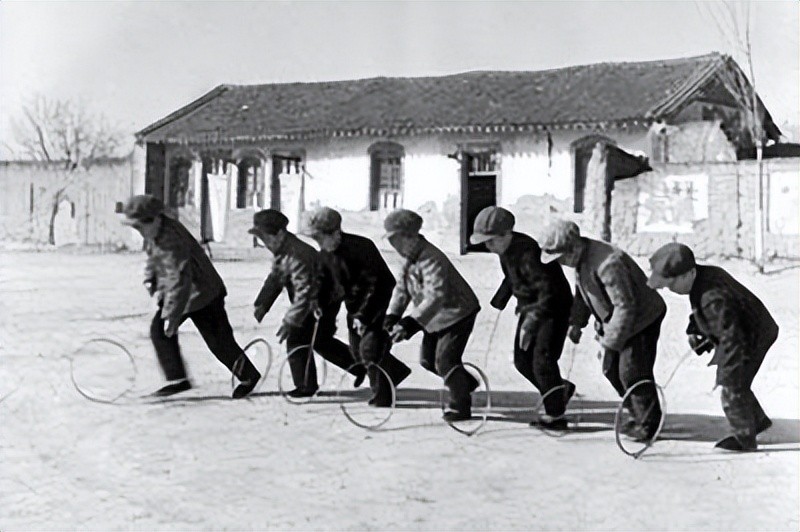 滚铁环,20 世纪60、70 年代出生的人玩的玩具有:滚铁环,这个是我们当年自己发明的小游戏,一个铁环都能玩得兴高采烈的。