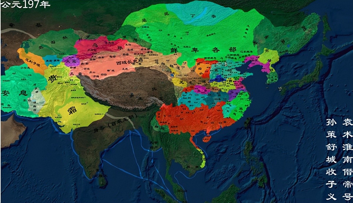 另一方面,在整体实力上,袁术巅峰时是当时最大的诸侯,扬州六郡基本全在袁术手上,再加上徐州的广陵郡、下邳郡,豫州的沛郡、陈郡、汝南郡等地,促使袁术势力的疆域在公元197年的时候保持领先。