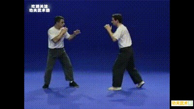 敌我双方均以左格斗式对峙;敌方以前手左直拳或左摆拳进攻我方上盘;我方立即向外旋左臂拨挡敌方右臂化解敌方攻来之拳,同时向右拧身以右直拳攻击敌方咽喉。