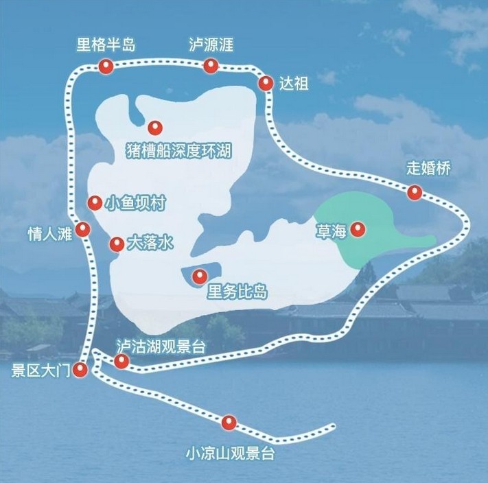 纳西妈妈认为大洛水→红涯子情人滩→观景台→里格半岛→小洛水→泸源崖→格姆女神山→情人滩→赵家湾→女神湾→草海走婚桥→川滇友谊桥→蒗放村→大洛水,这样环湖玩下来一圈的体验有趣又好玩,欢迎各位朋友们继续补充。