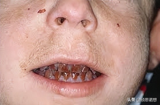 尖锐的牙齿和对大蒜的厌恶进一步加深了卟啉症与吸血鬼的联系。患者暴露在阳光下的身体部位出现严重的疤痕和畸形。卟啉在牙齿中积聚会导致特征性的红齿畸形,形成“尖牙”外观,发出怪异的微红色荧光,看起来像是残留的血液。而大蒜,由于其高硫含量,既能抑制天然血红素合成,又能加速血红蛋白降解,从而加剧卟啉症的爆发。患者并非真正恐惧大蒜,只是因为大蒜会加重疾病而不喜欢它。