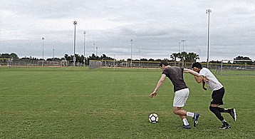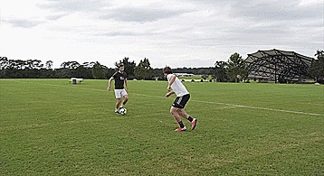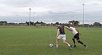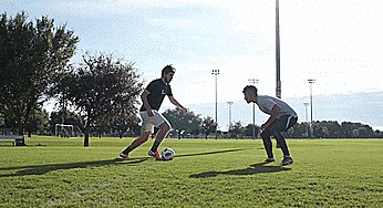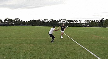 这个时候我们可以先将球微微拨向防守队员身侧,然后用同一只脚的脚内侧推球越过防守队员。