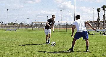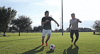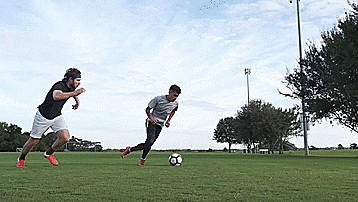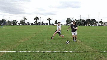 尤其是当我们切球突破防守队员的时候,我们一般是用脚内侧或者脚外侧推球突破防守队员。