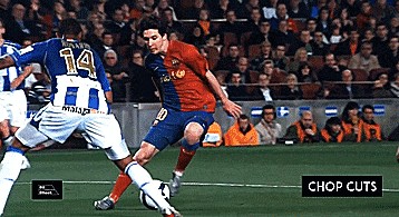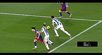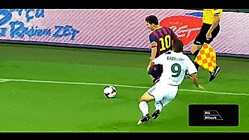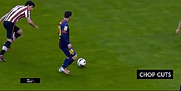 有时候梅西也这样做,但是他还有另一种技巧,他是用脚的边缘快速踢球的侧面。不像是推而更像是削。