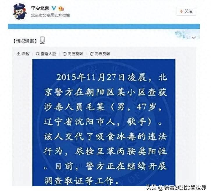2015年,一则重磅消息被警方爆出,原来是歌手毛宁被朝阳区群众举报吸毒,警方在接到报案后,火速出警。
